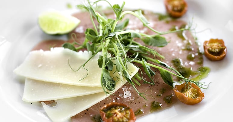 Tonfiskcarpaccio Med Rostade Tomater Och Basilikaolja Forratt Recept Och Ravarukunskap Spisa Nu